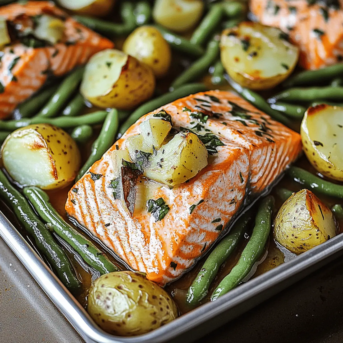 - Füge die grünen Bohnen und den gewürzten Lachs auf das Blech hinzu.