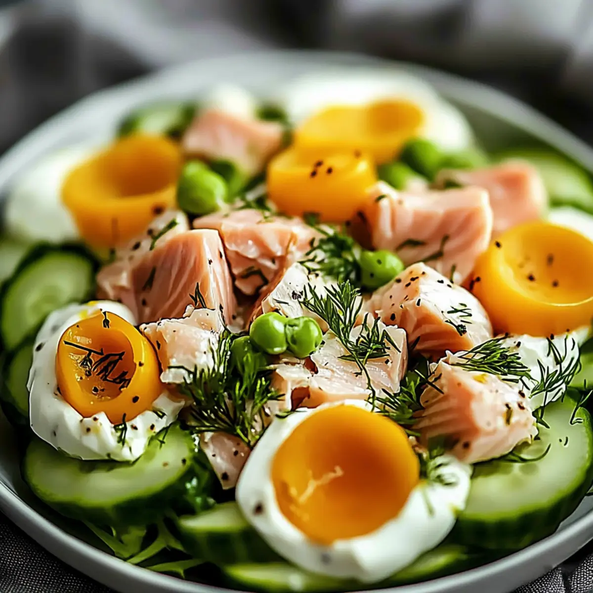 Frische Aromen: Dieser Salat kombiniert die knackige Frische von Gurken mit der Cremigkeit von Eiern und dem herzhaften Geschmack von Thunfisch.