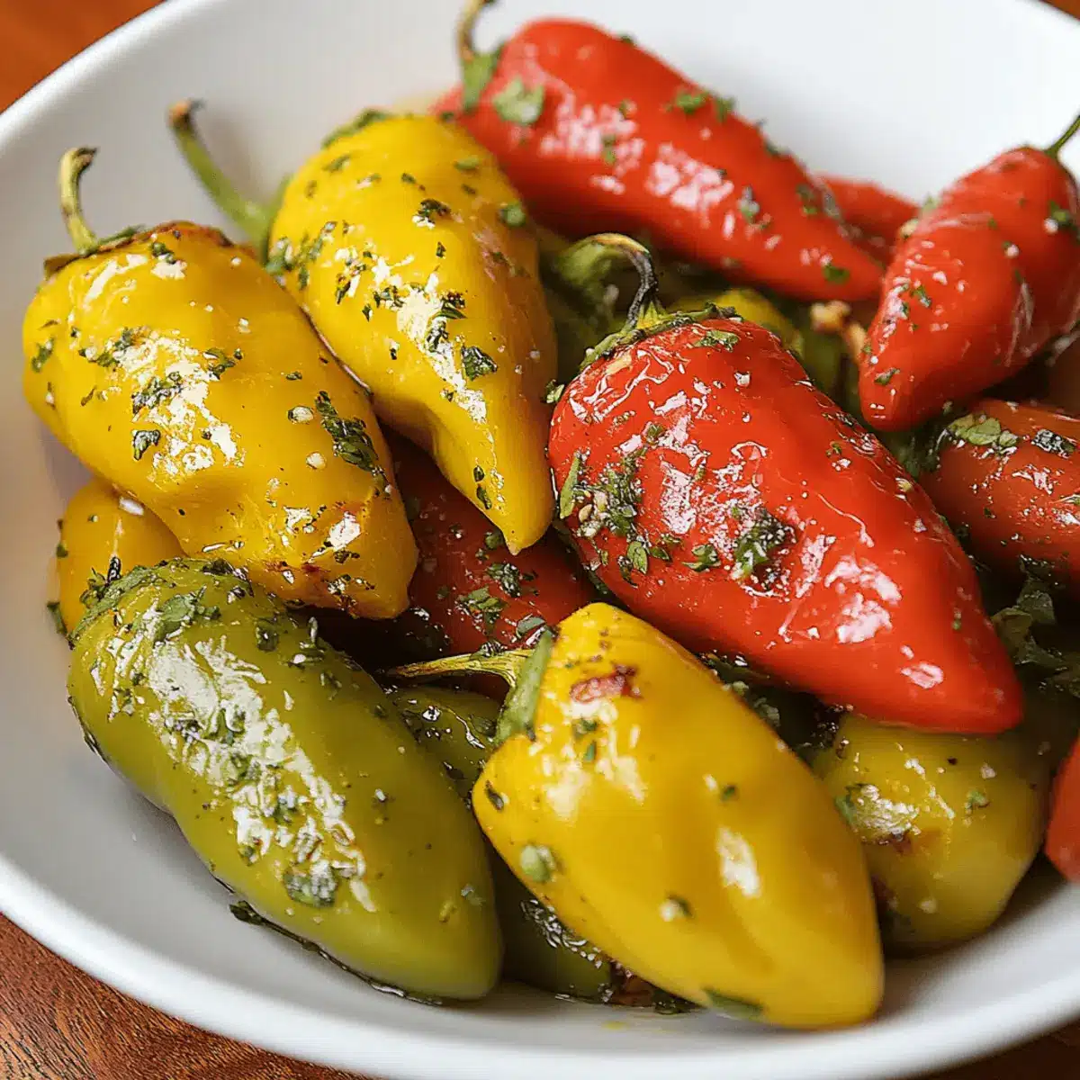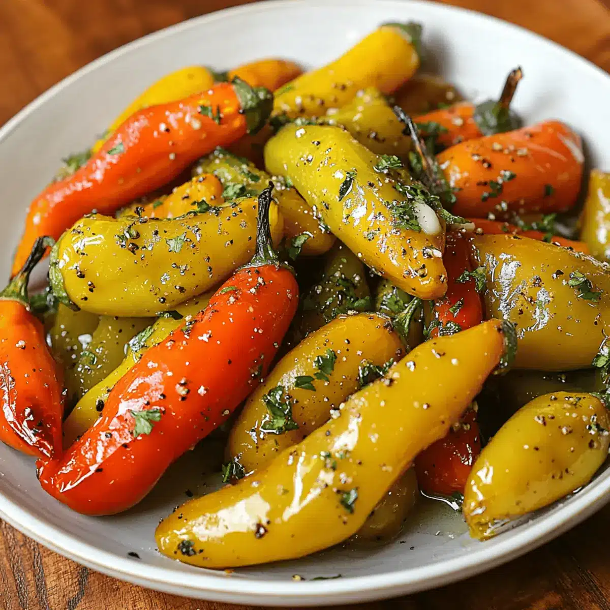 Wenden: Alles gut vermengen, sodass die Peperoni gleichmäßig mit den Aromen umhüllt sind. Das Öl hilft, den natürlichen Geschmack der Peperoni hervorzuheben.