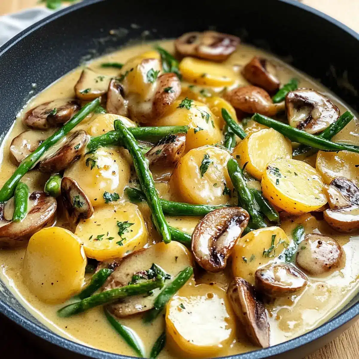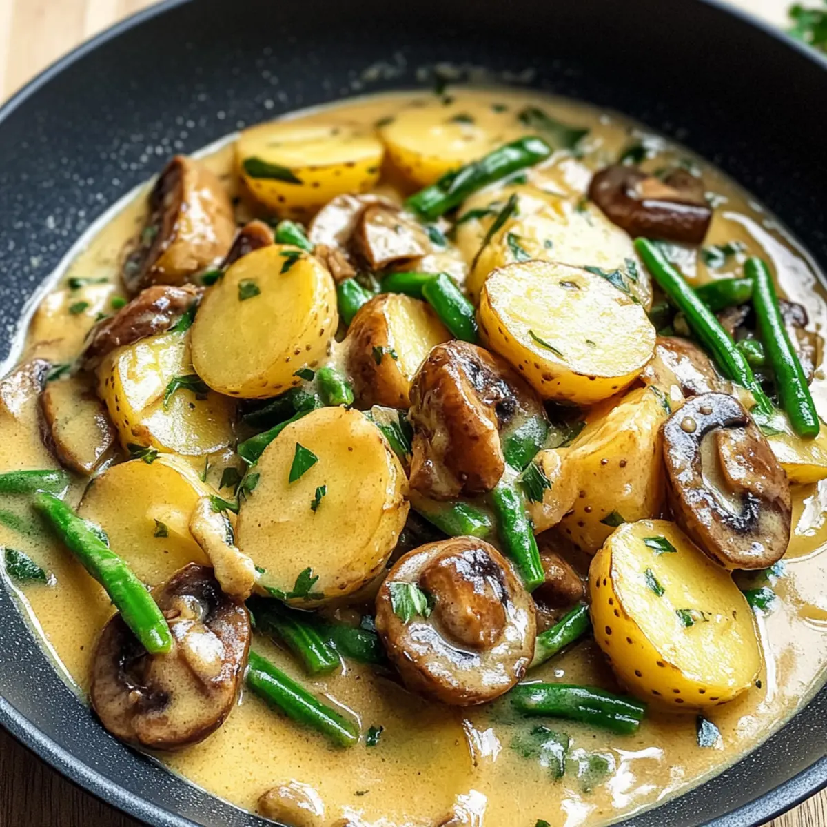 Herzhafter Geschmack: Die Kombination aus zarten Kartoffeln, knackigen Bohnen und aromatischen Champignons sorgt für ein Geschmackserlebnis, das begeistert.