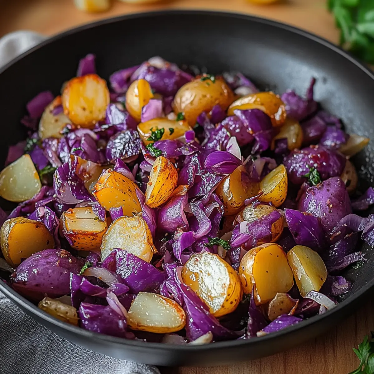 Herzhaft und nahrhaft: Dieses Gericht kombiniert die Süße des Rotkohls mit der herzhaften Knusprigkeit der Kartoffeln – einfach unwiderstehlich!