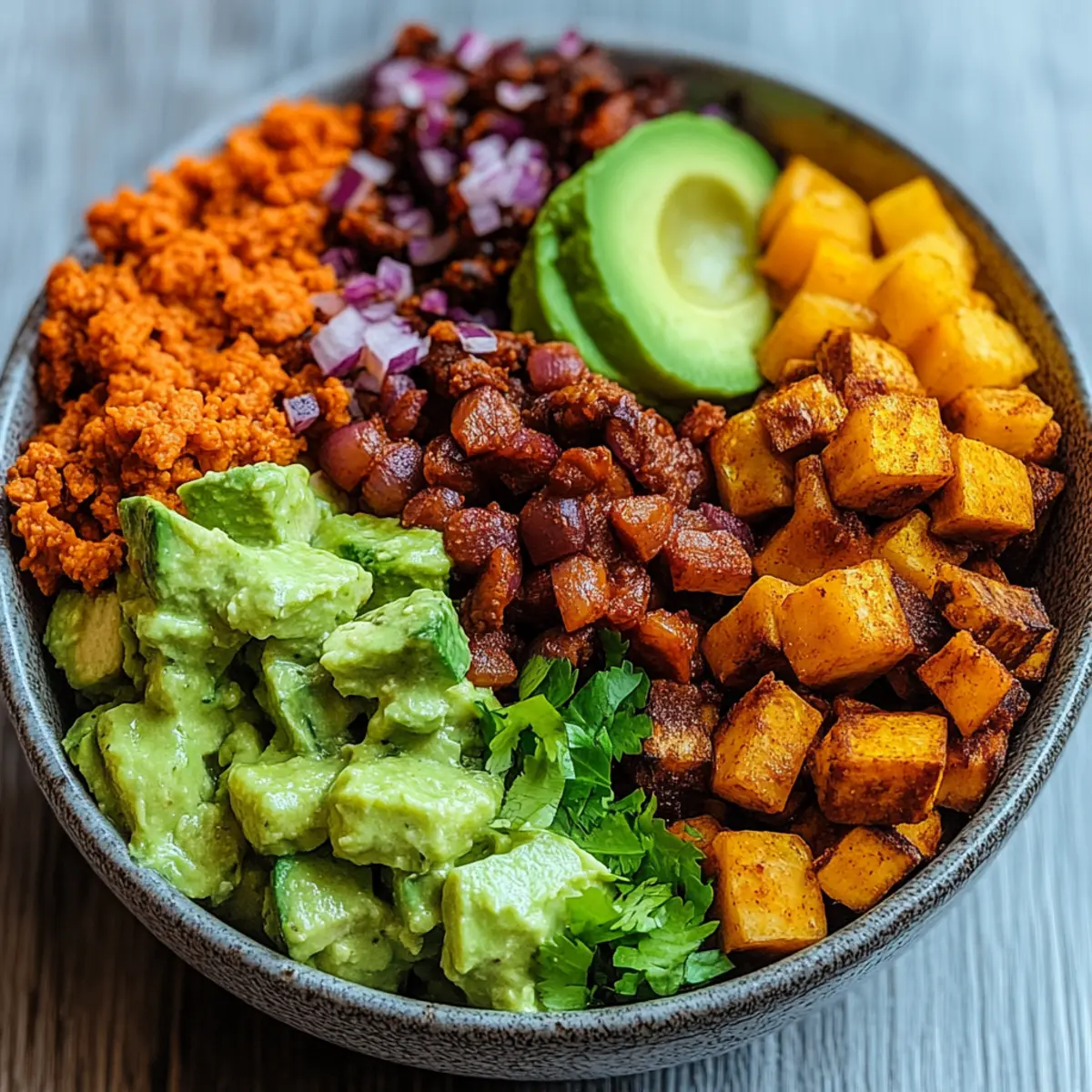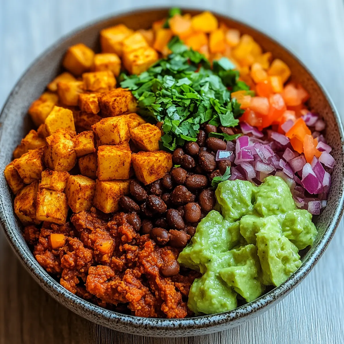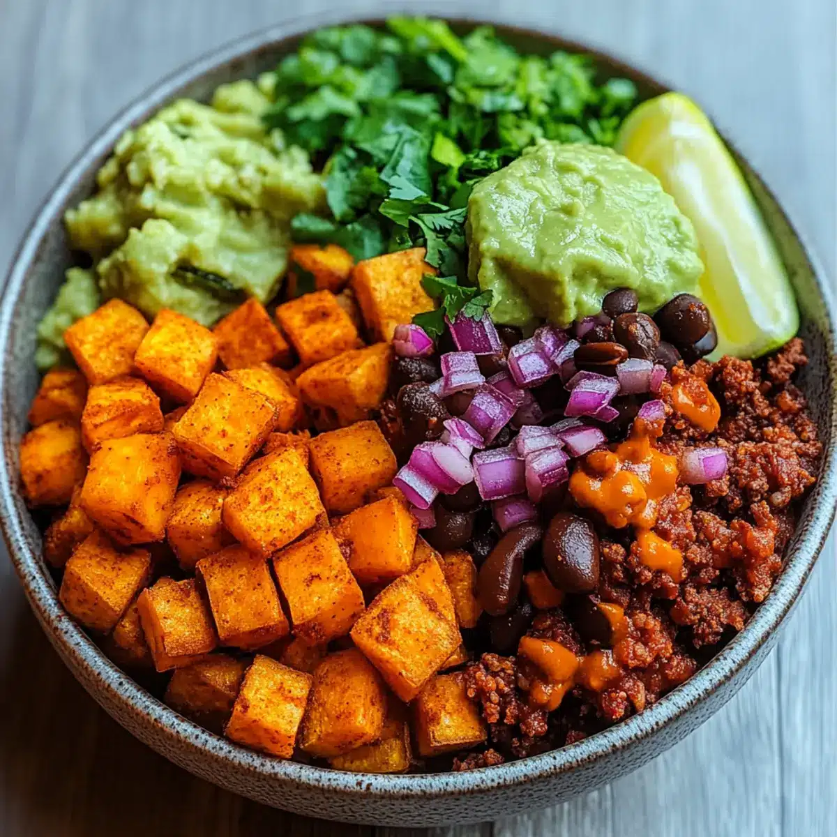 Guacamole: Diese cremige Avocado-Mischung fügt eine reichhaltige, handwerkliche Note hinzu und harmoniert wunderbar mit den Aromen der Süßkartoffeln und Bohnen.