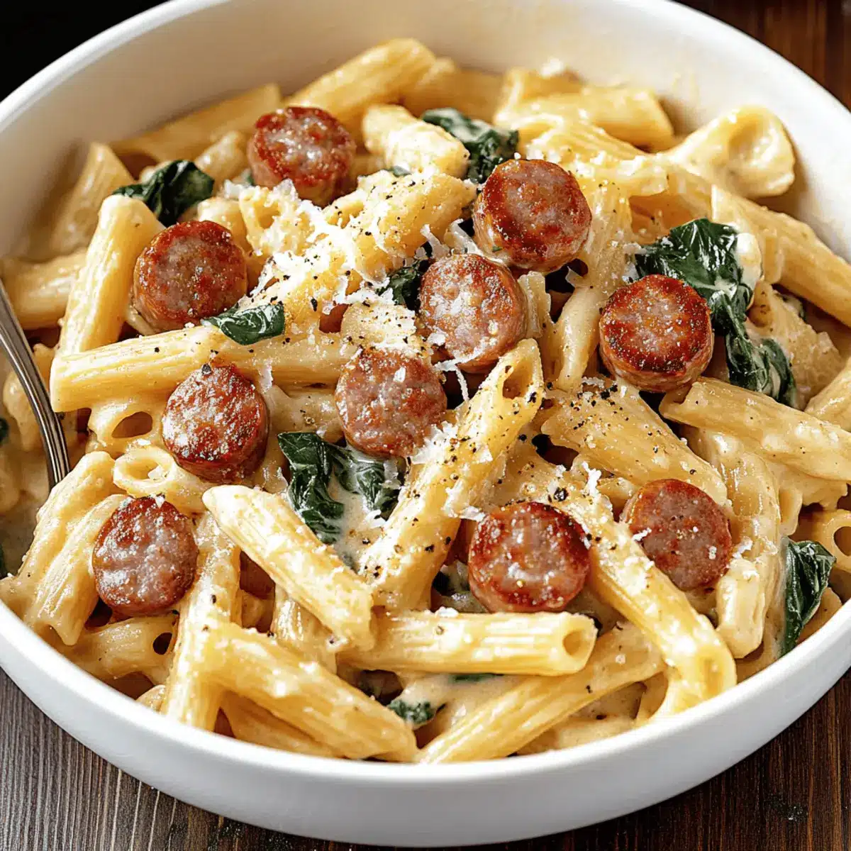 Sahne und Käse hinzufügen: Rühre die Schlagsahne und den Parmesan unter die Mischung, gib die Wurst zurück in die Pfanne und füge den Spinat hinzu. Koche alles, bis der Spinat zusammengefallen ist (1-2 Minuten) und würze nach Geschmack mit Salz und Pfeffer.