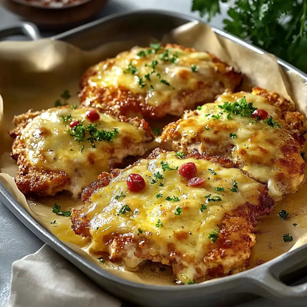Käsevariation: Experimentiere mit verschiedenen Käsesorten für das Topping. Manche Käse schmelzen besser und bringen eine neue Geschmacksnote in deine Überbackenen Partyschnitzel.